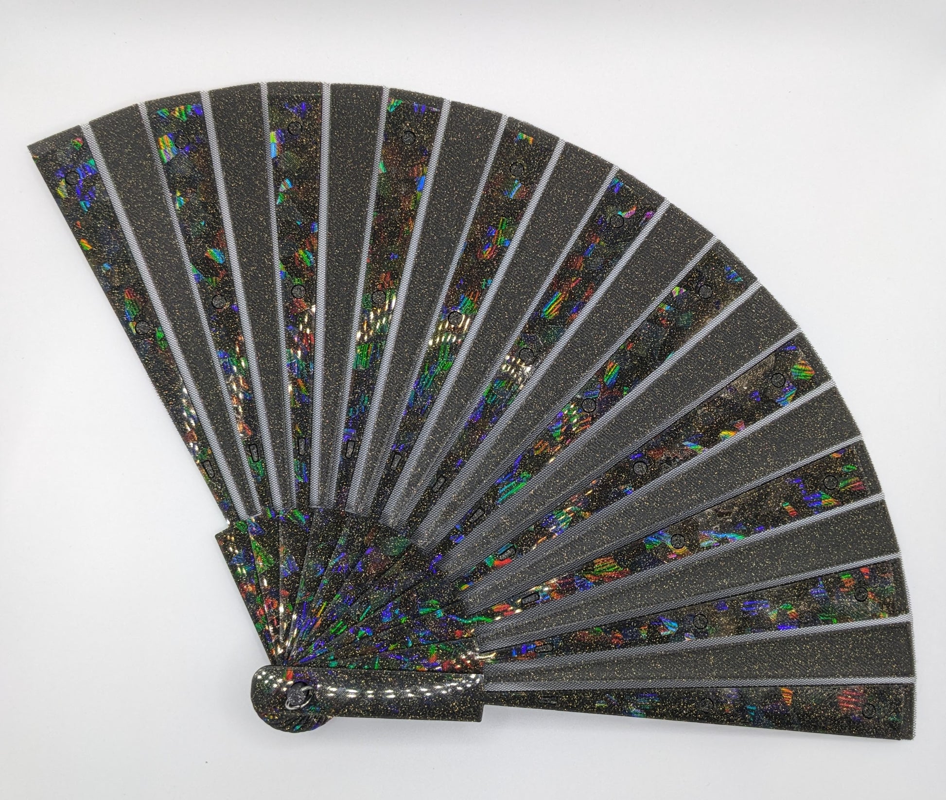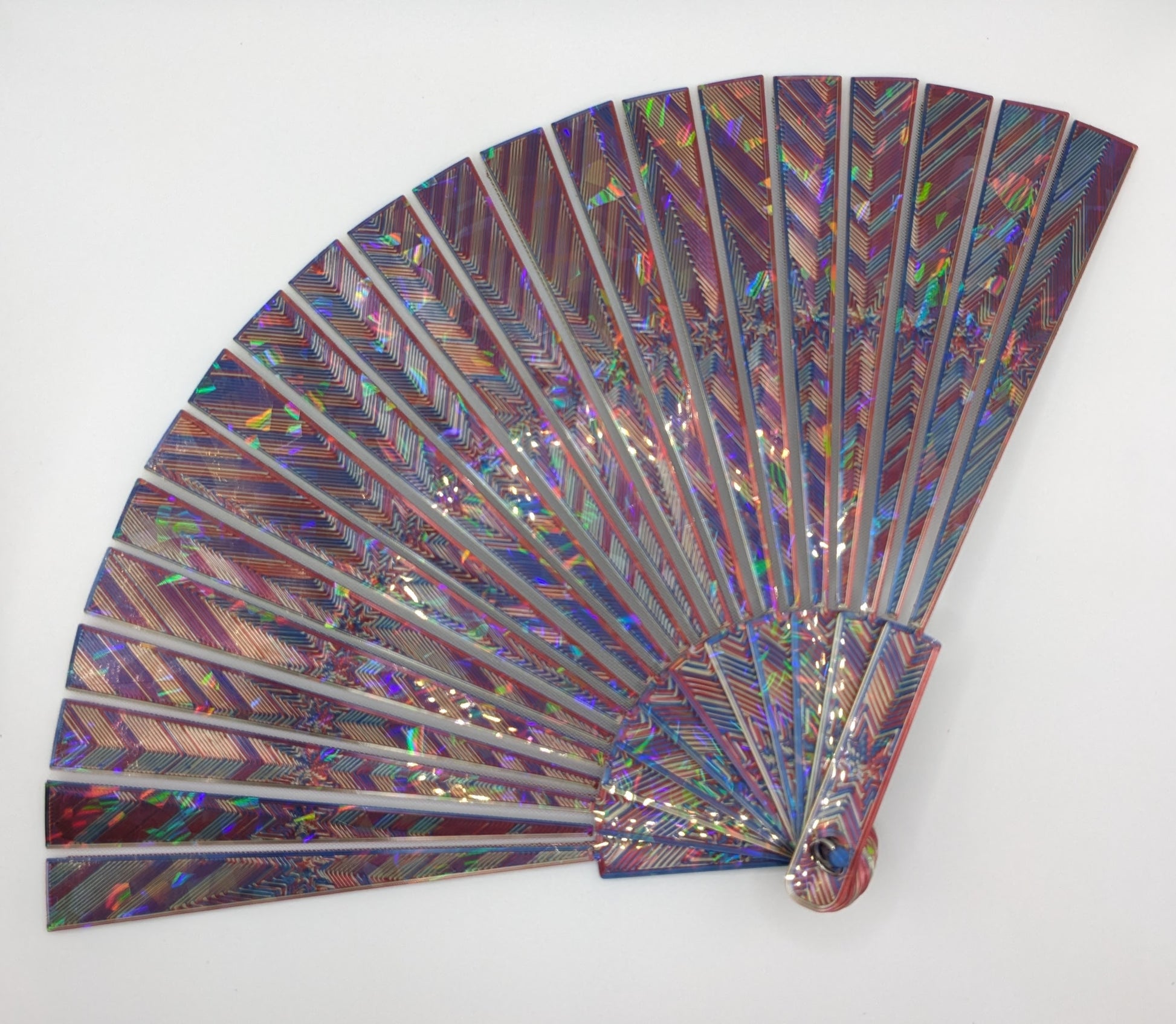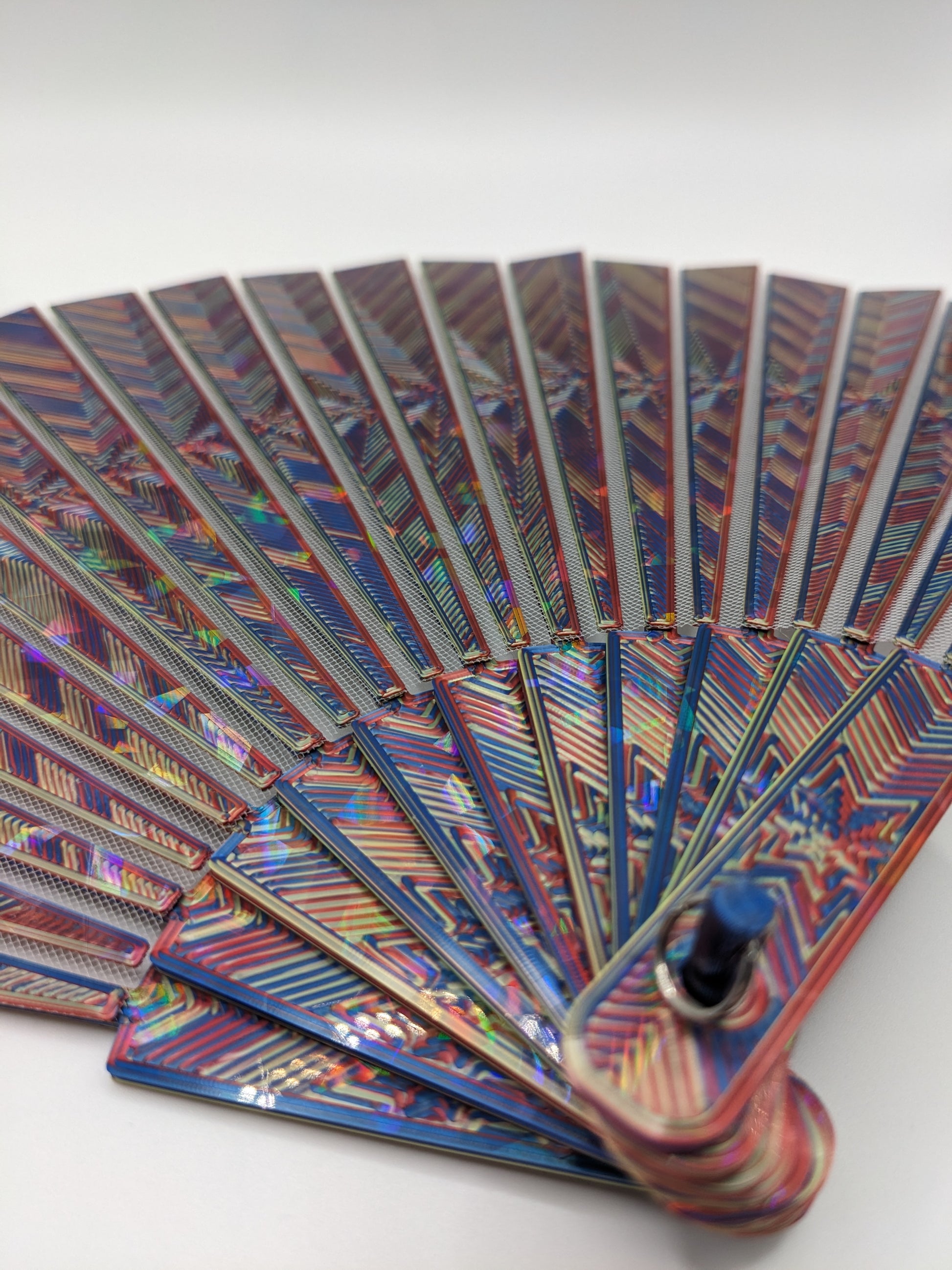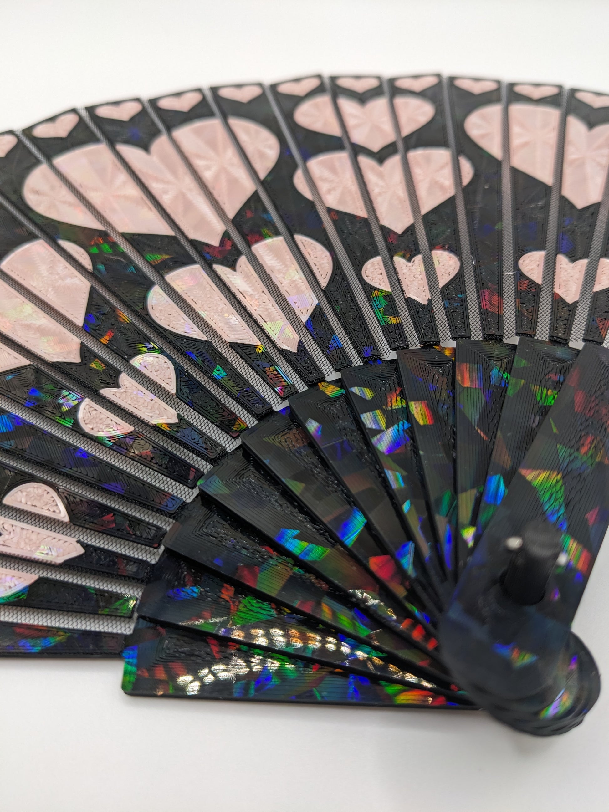 Stay cool with a 3D printed hand fan! Stylish, functional, and easy to deploy. These essential summer accessories were printed on our holographic PFLAT sheets to give an eye catching shimmer effect. Fabric is embedded within the print itself, enabling a durable folding mechanism.