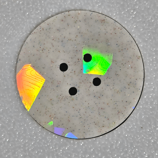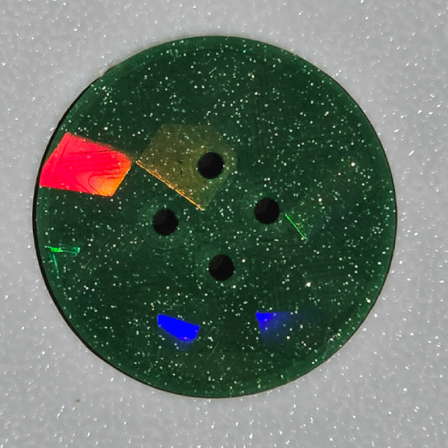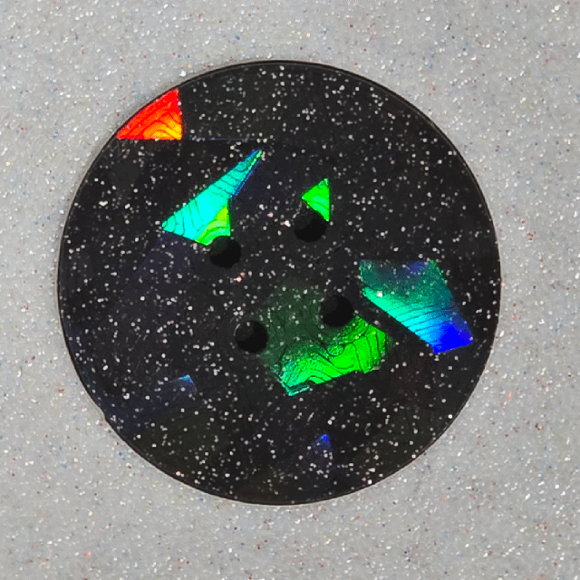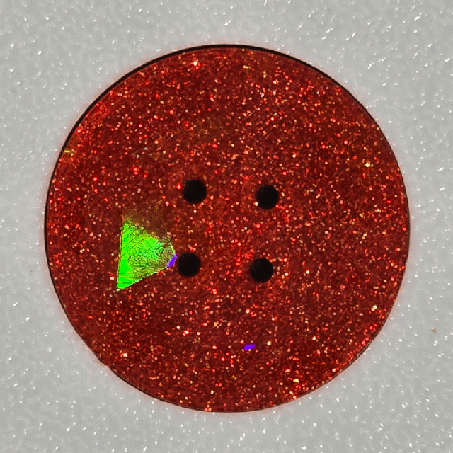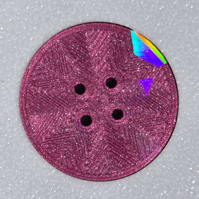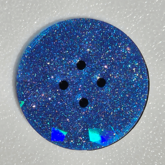 These are 3D printed with HTPLA. Each button has a holographic effect imprinted onto the surface. With excessive handling, the holographic effect can fade, but can be refreshed back to 100% with a small alcohol wipe to remove the oils.
