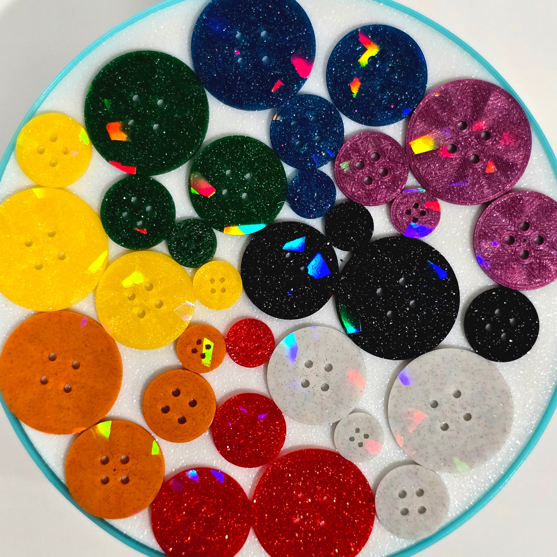 There are currently four sizes of buttons (10mm-25mm), with 8 base colors to choose from (Red, Orange, Yellow, Green, Blue, Purple, Black, and White). Pick and choose what sizes and colors you'd like. There is an assortment pack that contains 1 of each for a total of 32 buttons.