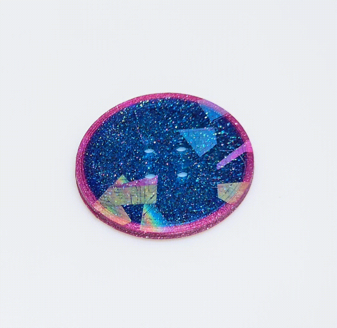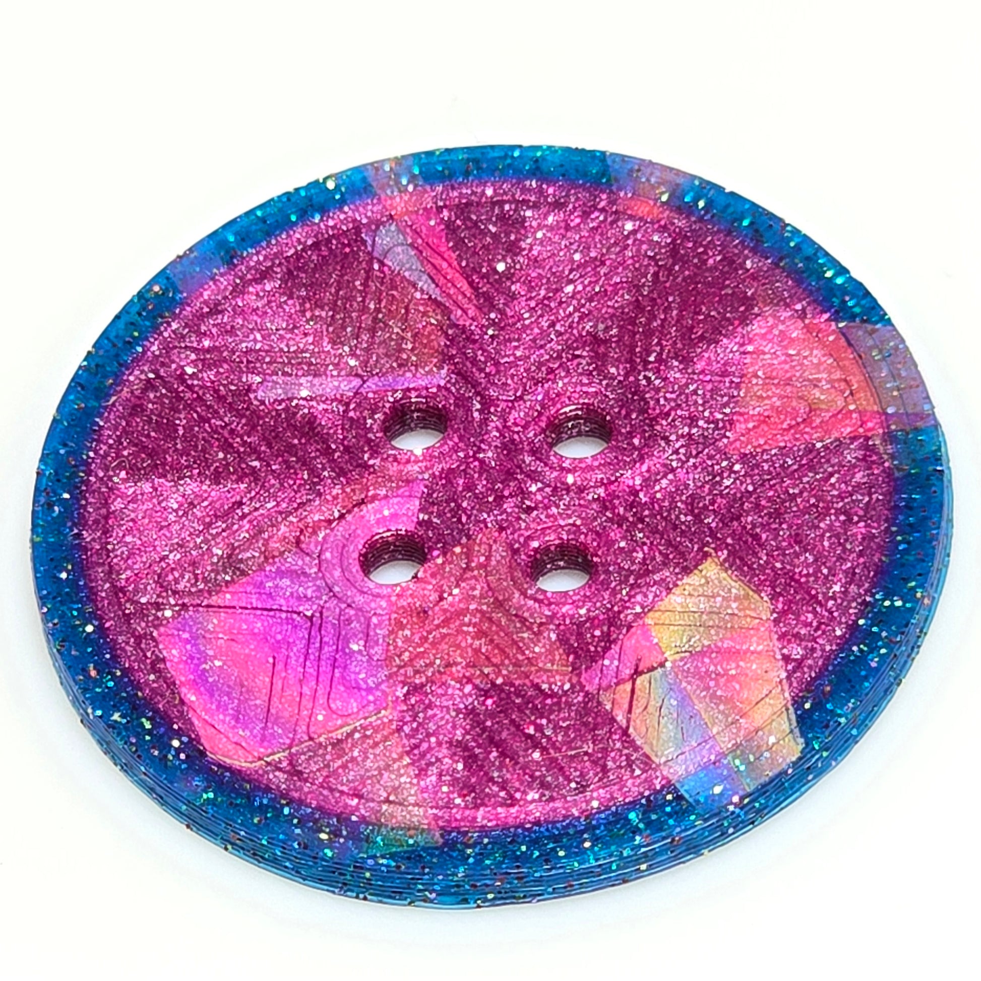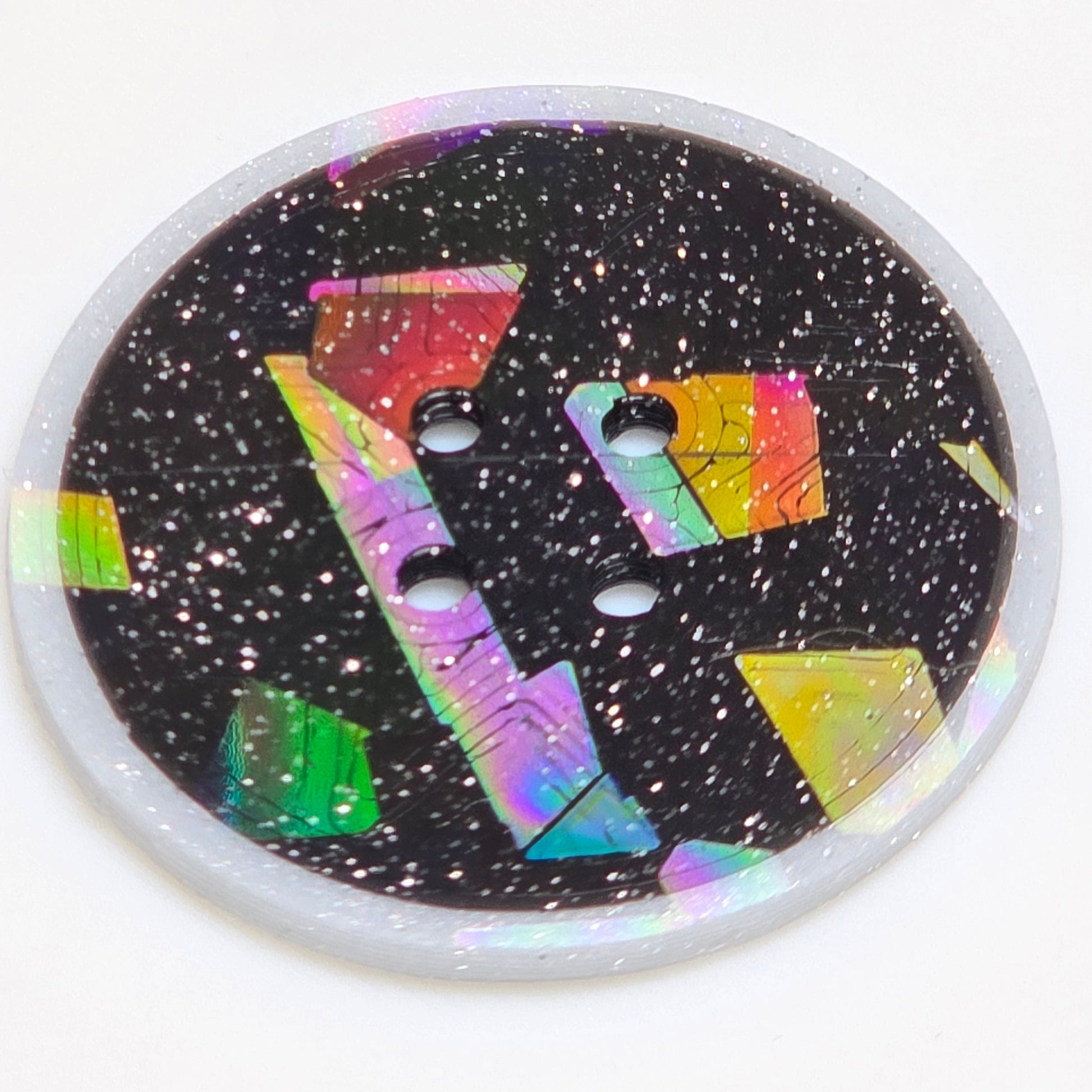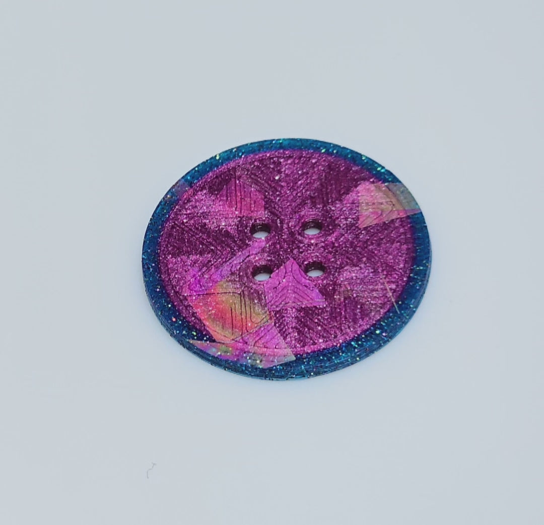 These are 3D printed with HTPLA from ProtoPasta. Each button has a holographic effect imprinted onto the surface. With excessive handling, the holographic effect can fade, but can be refreshed back to 100% with a small alcohol wipe to remove the oils.