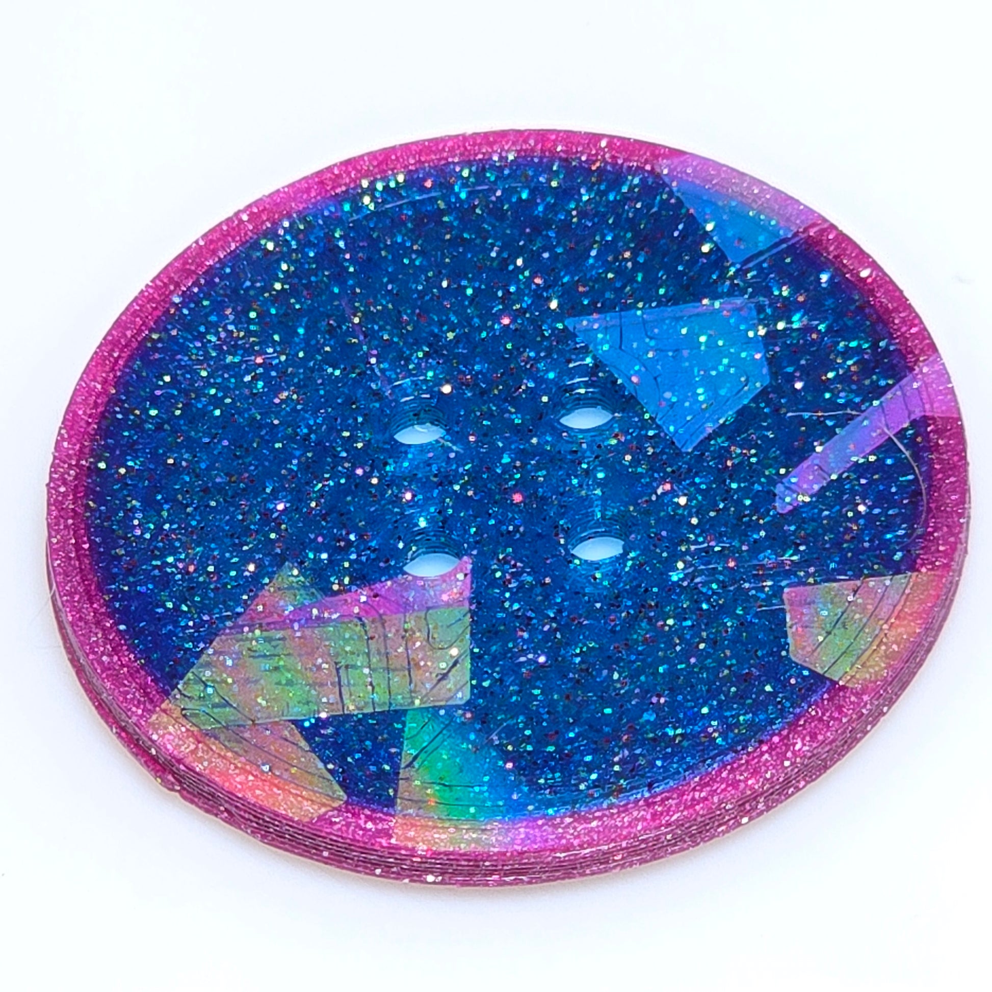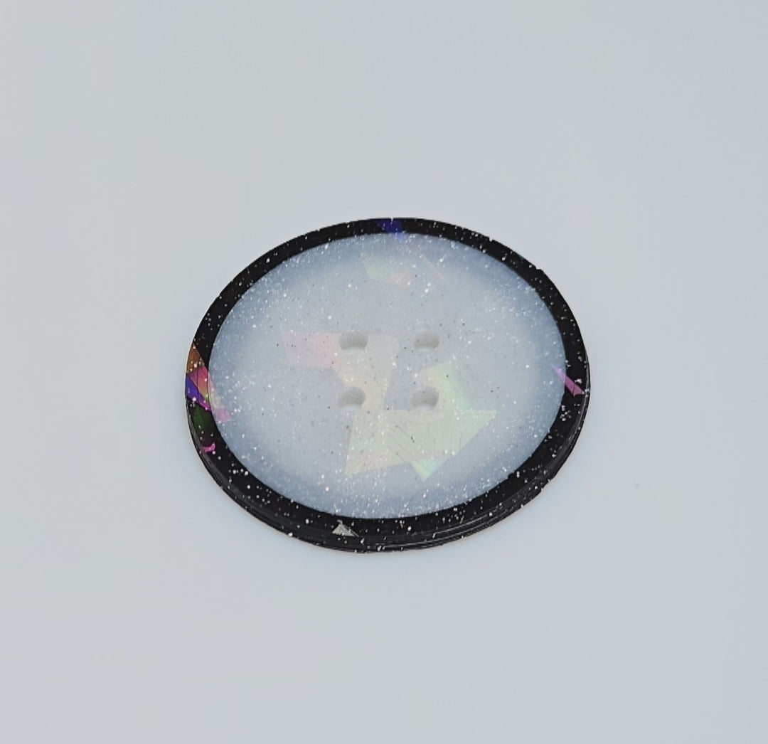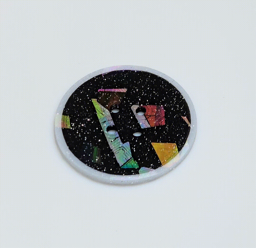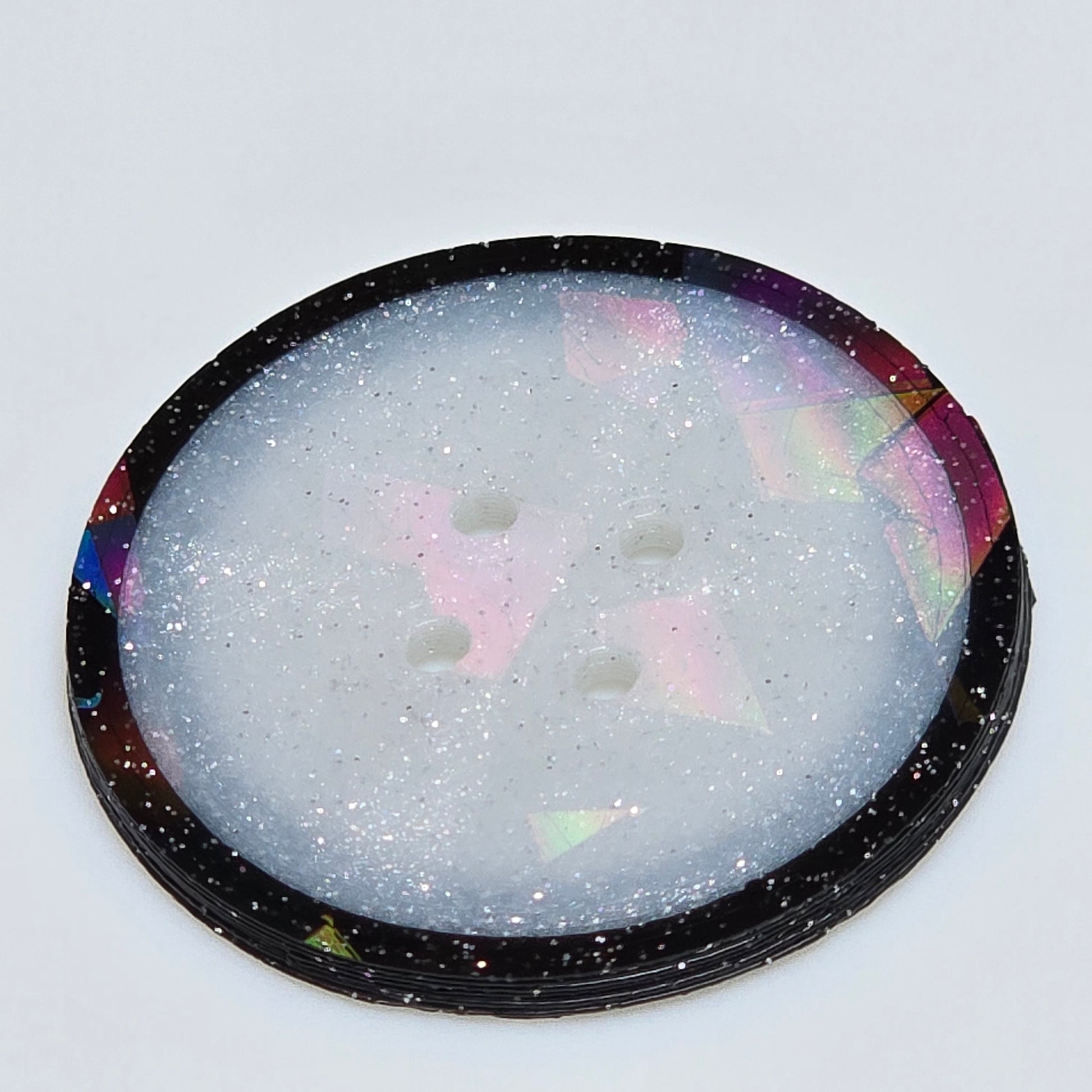 These are 3D printed with HTPLA from ProtoPasta. Each button has a holographic effect imprinted onto the surface. With excessive handling, the holographic effect can fade, but can be refreshed back to 100% with a small alcohol wipe to remove the oils.